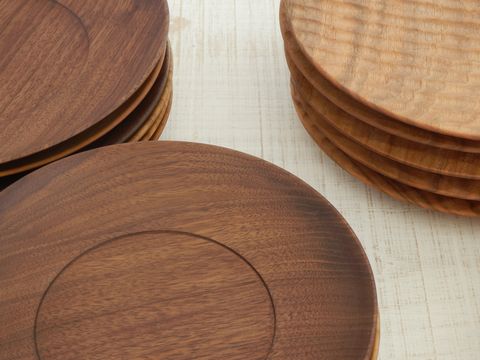 フチの付いたもの。リムのお皿のようなもの。なにも飾りのない普通なものの3種類つくっております。材料は桜、チェリー、胡桃、ウォールナット、楓、楢、花梨など様々な材料でそろえております。